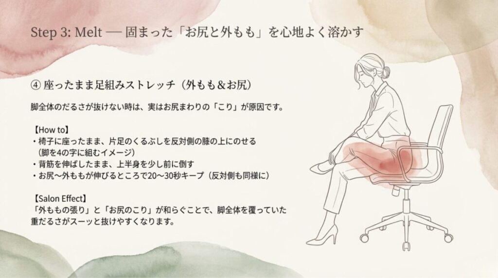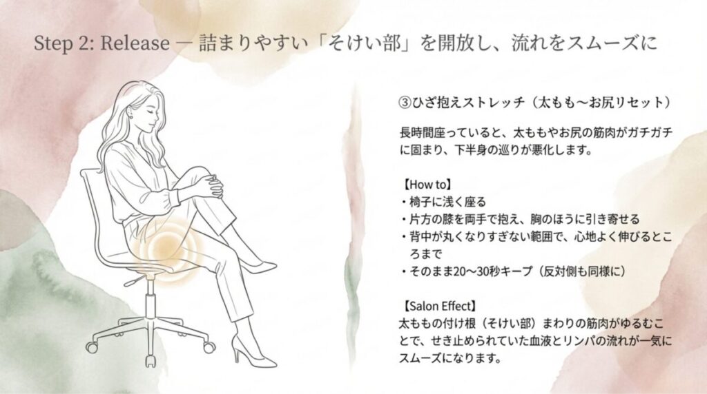 長時間同じ姿勢だと、ふくらはぎの“ポンプ”が働かず、血液やリンパが下半身に溜まりやすくなります。