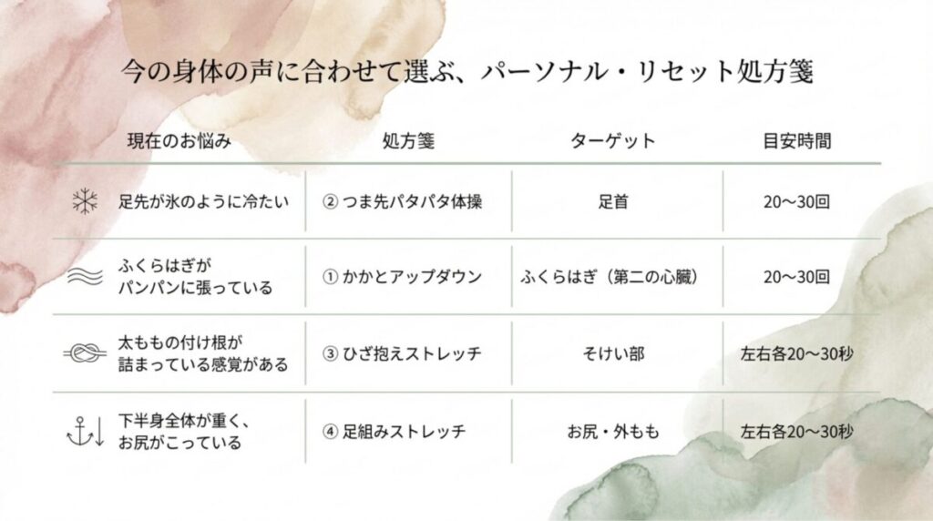 そこに冷えやストレス、運動不足、塩分過多などが重なると、「夕方になると足だけ別人のように太く重い」という状態が続いてしまいます。